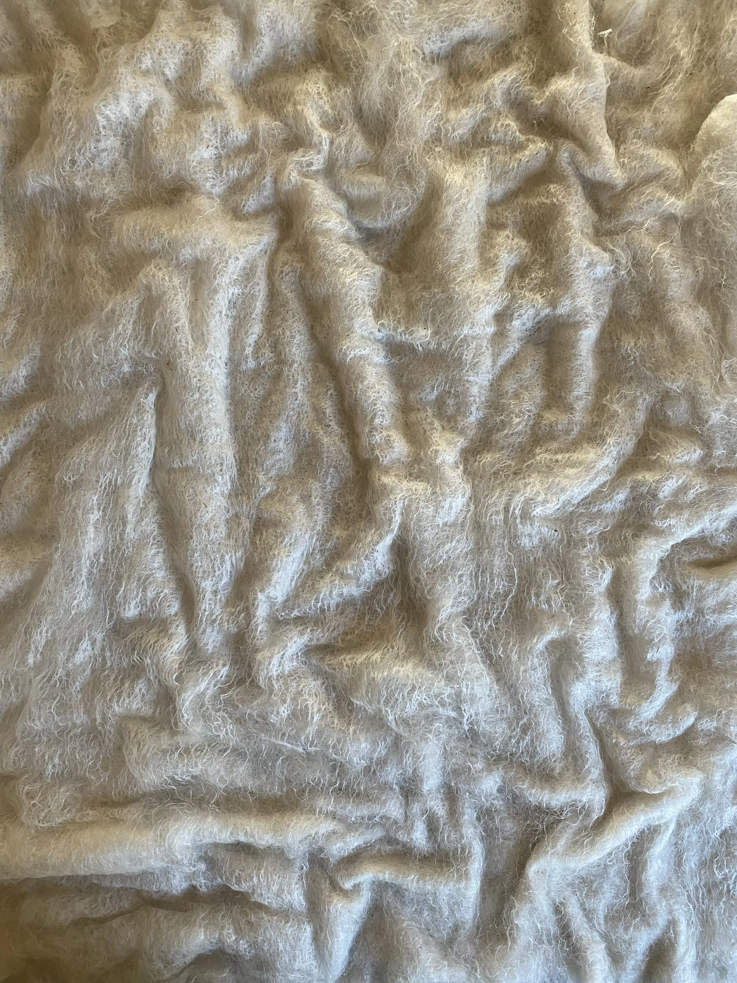Laying out Combed Border Leicester fleece for mounting the “Folding vernacular” pieces.
